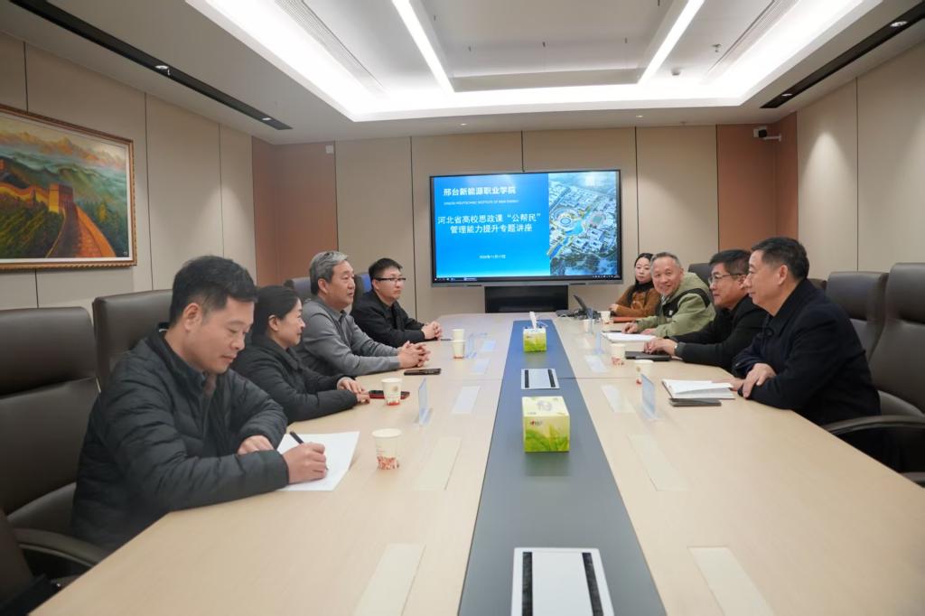 在研讨环节,双方围绕金沙3777建设、思政课教学改革创新等议题展开深入交流。王宏斌经理作了以管理能力提升为主题的专题讲座,结合石家庄铁道大学金沙3777建设经验,分享了思政课改革创新的实践路径,并就名师工作室建设、智慧课程开发、教师科研能力提升等方面提出合作建议。邢台新能源职业学院领导及教务部门负责人就课程建设、青年教师培养等话题与专家团队进行了深入交流。